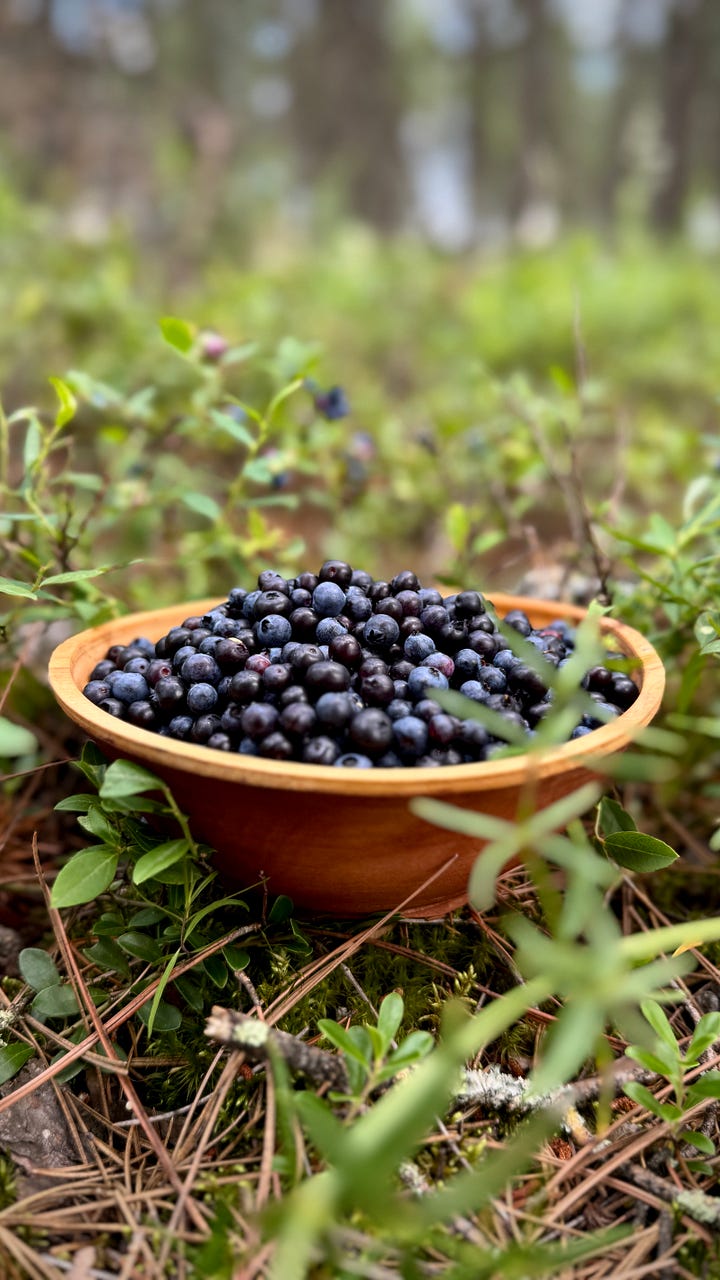 Right now, backyards, ditches and forest floors are an embarrassment of riches when it comes to these delightfully tart little jewels and I have spent the better part of the last few weeks taking advantage of my personal favorite being in season- blueberries! Battling ticks and deer flies with a can of bear spray at my side and a green Menards bucket in my hand, I have been walking hunched over through the woods, gathering blueberries like a feral little forest gnome. It’s well worth the back problems and bug bites though as wild blueberries are far superior to anything you will find at a farm or in a grocery store. Although often smaller in size, their flavor is unmatched thanks to the natural habitat they’ve found here in the northwoods.